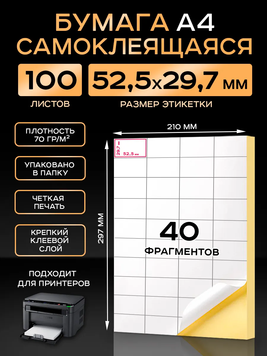 Белая матовая самоклеящаяся бумага формата А4 — универсальный канцелярский товар для офиса, школы и дома. В упаковке 100 листов плотность 80 г/м². Лист разделен на 40 фрагментов, размер каждого фрагмента 52,5х29,7 мм. Самоклеящаяся бумага отлично подходит для лазерных и струйных принтеров, ксероксов и другой оргтехники. Используется для печати этикеток, стикеров, штрихкодов, логотипов, ценников и маркировки товаров на маркетплейсах, а также для почтовых отправлений, упаковки и рекламной продукции. Клейкий слой позволяет легко приклеивать бумагу к гладким и шероховатым поверхностям без дополнительного клея и скотча. Прочная фиксация, не отклеивается со временем. Бумага устойчива к выцветанию, влаге и механическим повреждениям. Желтая обратная сторона помогает не перепутать сторону с клеем при печати. Идеальна для использования в офисе, для школьников, студентов, педагогов, а также для творчества и создания индивидуальных наклеек. Отличная альтернатива термопринтеру — достаточно обычного принтера, чтобы напечатать самоклеящуюся этикетку. Незаменимая канцелярия для бизнеса, делопроизводства и организации хранения.