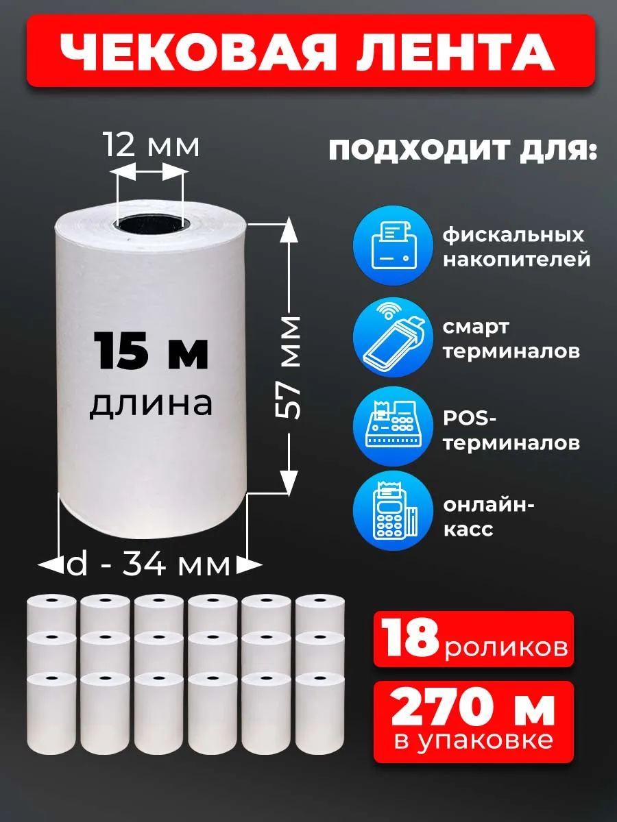 Чековая лента 57 мм -длинна рулона 15 метров, 18 роликов, в различных комплектациях таких как 18/36/72/144рулона по очень приемлемой цене. Сигнальная лента- есть - за 50 см. до конца Вы найдете в нашем ассортименте. Чековая лента 57 мм применяется для кассовых аппаратов, платежных терминалов самообслуживания, банкоматов и т.п. Диаметр рулона: 34мм. Диаметр втулки: 12 мм. Плотность бумаги: 46 г/м2. Термослой: наружу. Сегодня сложно представить современный магазин или торговый центр без кассовых аппаратов. Они нужны для ведения отчетности, выдачи гарантии и чеков покупателям. Чековая бумага сделана из качественных безопасных материалов. Кассовая лента изготовлены на современном оборудовании, обеспечивающем ровную намотку и отсутствие бумажной пыли. Лента кассовая 57 мм идеально подходит для онлайн касс: Атол, ICASH, Пирит, Эвотор, СПАРК, Меркурий, ПРИМ, Штрих и др., квитанции в pos-терминалах при наличных и безналичных расчетах банковской картой и при использовании эквайринга и мобильных касс в магазинах, заведениях, курьерских службах, всех сфер услуг и торговли. Кассовая лента 57 мм подходит для всех современных POS терминалов: Ingenico, Verifone, PAX и др. А так же чек лента подойдет для онлайн касс: Атол, ICASH, Пирит, Эвотор, СПАРК, Меркурий, ПРИМ, Штрих и др. Кассовая бумага позволяет получить печать чека высокого качества и продлевают срок службы оргтехники. Чековая лента надежно упакована, спайка защищена от влаги термоусадочной полиэтиленовой пленкой. Бумага белая, Кассовые ленты подходят для аппаратов, в которых для переноса печати используется нагрев. Такую кассовую ленту легко поменять. Используется как контрольно-кассовая лента. Цвет печати - черный Кассовая лента / чековая лента / термобумага. "чековая лента 57 мм,чековая лента 57,чековая лента 57*40*12,чековая лента 57*30*12,чековая лента 57*6012,чековая лента 57*40,чековая лента 57*17,чековая лента 57*30,чековая лента 57*60*12,чековая лента 57 мм 40м,кассовая лента 57.