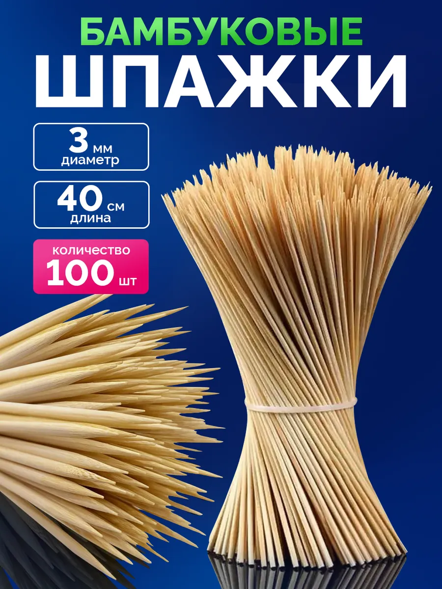 Шпажки деревянные длинные бамбуковые 100 шт. отличный выбор для любого любителя гриль-вечеров или профессионального повара. В нашем ассортименте широко представлены для различных кулинарных целей - гриллинга, декораций, канапе и украшая сьедобные букеты. Обычно отдыхающие для этих целей используют шампуры, вертел, гриль или аэрогриль. Бамбуковые палочки активно используются в кулинарии для приготовления канапе и шашлыков. Куриные, рыбные или мясные шашлычки на шпажках, а также запеченные овощи могут с лёгкостью стать вашим коронным блюдом, они улетают со стола мгновенно. У нас Вы можете приобрести купить деревяные шпажки разной длины: 15, 20, 25, 30см, 35 или 40 сантиметров предназначенные для разных целей. На 8 марта, день рождения, новый год или любой другой праздник можно сделать для любимого человека букет из сладостей. Набор шпажек из бамбука подходит для изготовления съедобных букетов, оформления тортов и других кондитерских блюд. Такая пика представляет собой одноразовый деревянный или бамбуковый шампур, заостренный с одного конца. Бамбуковые декоративные шпажки для канапе не только упругие, но в тоже время и эластичные. Формочки для канапе. Они не просто удобны для приготовления мяса, это ещё и украшение посуды, формы и подачи праздничных закусок к столу. Декоративные пики - это универсальный хозяйственный товар для постоянного применения в быту и дома. Они очень прочные, и более легкие, чем деревянные. Шпажки можно использовать для поделок и рукоделия. Благодаря шпажкам можно украсить любой праздничный стол