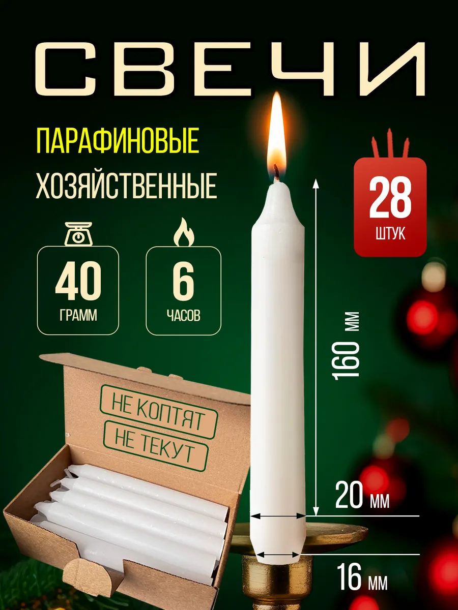 Парафиновые хозяйственные бытовые свечи Unzi. Данный размер свечи горит на протяжении 6 ЧАСОВ*. Не трещат, не коптят, не текут. Высота свечи:16,5 см . Вес одной свечи: 40 грамм (+/-10%).. Диаметр свечи: 16мм. Комплект: 28штук. Свечи - это не только источник света, но и прекрасный элемент декора для вашего дома. Самое главное, качественные свечи проверяются на вес, чем больше граммов, тем больше вероятность, что парафин не вспененный, а значит горит долго. Выполнена из качественного парафина по стандартам. Хлопковый крученный фитиль. Не трещат, не коптят, горят ярким ровным пламенем. Экономичные толстые большие свечи столбики. Толстые и большие — долго и ярко горят, не деформируются. Парафиновые свечи декоративные для подсвечника идеально подойдут для оформления интерьера и освещения комнаты. Свечи для дома — это отличный способ создания романтической атмосферы, атмосферы праздника, будь то День Святого Валентина, Свадьба, Рождество, а также на Годовщину свадьбы или отношений. Подойдут для романтических вечеров, для украшение декора свадеб и вечеринок. Свечи абсолютно безопасны, мы используем высококачественный парафин для изготовления хозяйственных свечей. Полевые свечи, окопные свечи, свечи столбик для обогрева; античные свечи, белые большие свечи, свечи от производителя, свечки парафиновые, свечи большие, свечи хозяйственные большие. Можно использовать в подсвечниках и канделябрах. Универсальный садовый вариант подходит для теплиц на даче. А так же для туризма, рыбалки и охоты. * Максимальное горение достигается температурой в помещении более 20гр, важно, чтобы поверхность на которой стоит свеча была не металлическая. Не было сквозняка.