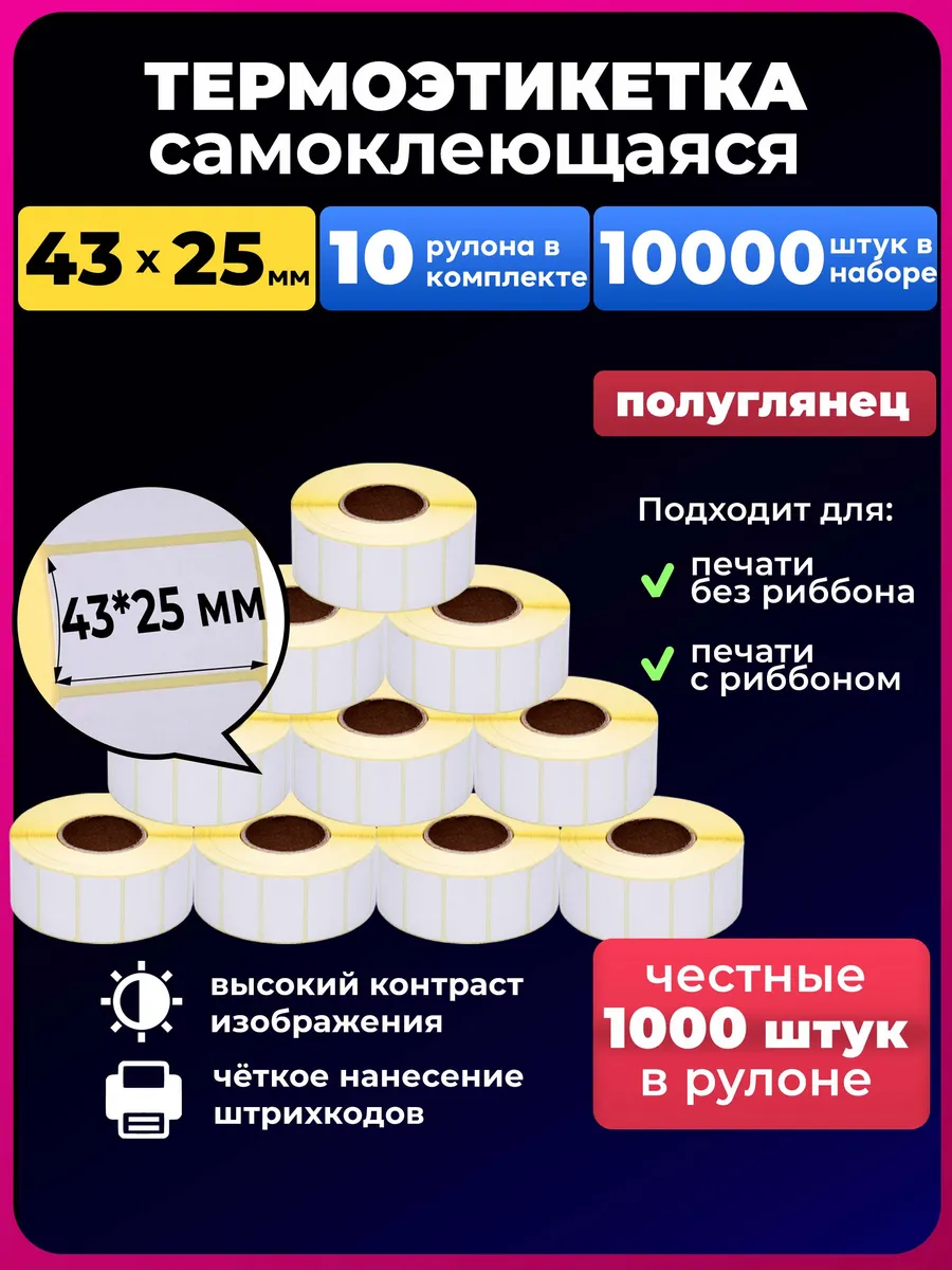 Термоэтикетки 43х25 ЭКО мм Unzi - это оптимальное решение для оперативной печати информации, необходимой для маркировки различной продукции в том числе и маркировки товаров для маркетплейсов. Такие термоэтикетка ЭКО могут выступать в роли носителя информации о товаре или же штрих-кода. Изготавливаются из белой бездревесной бумаги с термочувствительным покрытием.В нашем ассортименте Вы найдете широкую линейку размеров термоэтикеток и количества этикеток в 1 упаковке.Описание товара:Ширина этикетки - 43 мм.;Длина этикетки - 25 мм.;Трмоэтикеток в рулоне - 1000 шт.;Внешний диаметр рулона - 70 мм.Области применения термо-этикеток Unzi: этикетки имеют самую широкую сферу применения отлично подходит для:\- Для маркетплейсов: для маркировки товаров поставщиков маркетплейсов;\- В магазинах\, аптеках : маркировка товаров/продукции;\- Дома: на данном виде этикеток можно писать маркером\, ручкой или карандашом;\- Логистических комплексах/складах для маркировки грузов;\- Весы: маркировка весовых товаров;\- На производствах: для контроля этапов производства;\- Интернет магазинах: для маркировки отправлений или товаров на складе\.Размер этикетки 58х60 мм. соответствует стандартам OZON для маркировки товаров поставщика.Экономичность. Доступная цена на этикетку является одним из главных ее преимуществ. Чёткость печати. На этикетку Unzi Термо может наноситься абсолютно любая информация. Это могут быть буквенно-цифровые символы, штрих-коды, изображения или какие-либо другие данные. Напечатанное изображение отличается высокой контрастностью, что обеспечивает хорошее считывание сканирующими устройствами.Термоэтикетки отличаются наличием термочувствительного слоя на лицевой стороне, который темнеет при воздействии термоголовки термопринтера. Для работы с этикеткой можно использовать принтеры брендов АТОЛ, xPrinter, TSC, Datamax, Toshiba, Argox, Godex, Zebra, Intermec и ряда других производителей.