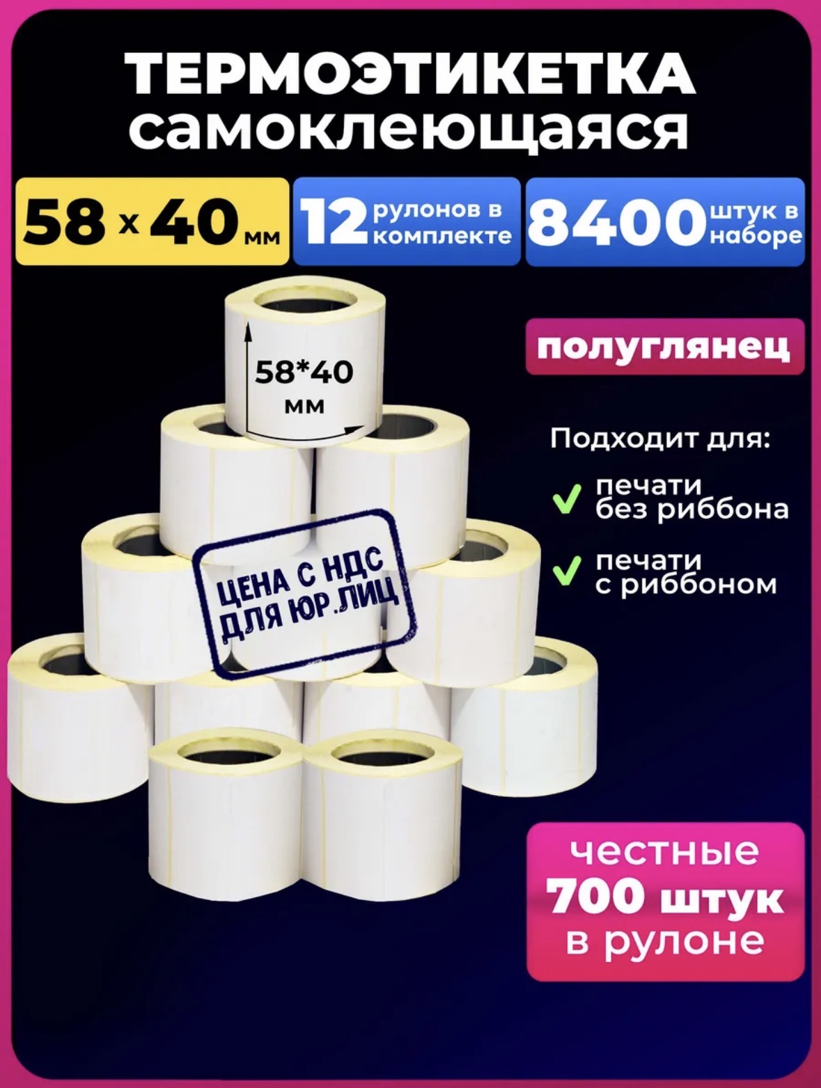 Термоэтикетки 58х40мм эко Unzi - это оптимальное решение для оперативной печати информации, необходимой для маркировки различной продукции в том числе и маркировки товаров для маркетплейсов. Такие термоэтикетки могут выступать в роли носителя информации о товаре или же штрих-кода. Изготавливаются из белой бездревесной бумаги с термочувствительным покрытием. В нашем ассортименте Вы найдете широкую линейку размеров термоэтикеток и количества этикеток в 1 упаковке Ширина этикетки - 58 мм.; Длина этикетки - 40 мм.;Термоэтикеток в рулоне - 700 шт.;Внешний диаметр рулона - 70 мм.Внешний диаметр втулки - 40 мм.Количество рулонов в упаковке - 1 шт. Для маркетплейсов: для маркировки товаров поставщиков маркетплейсов; маркировка товаров/продукции; Дома: на данном виде этикеток можно писать маркером, ручкой или карандашом; Логистических комплексах; Весы: маркировка весовых товаров;На производствах: для контроля этапов производства Интернет магазинах: для маркировки отправлений или товаров на складе.Размер этикетки 58х60 мм. соответствует стандартам OZON для маркировки товаров поставщика.Экономичность.Чёткость печати. Термоэтикетка 58х40мм для весов, для маркировок. На этикетку Unzi Термо может наноситься абсолютно любая информация. Это могут быть буквенно-цифровые символы, штрих-коды, изображения или какие-либо другие данные. Напечатанное изображение отличается высокой контрастностью, что обеспечивает хорошее считывание сканирующими устройствами.Термоэтикетки отличаются наличием термочувствительного слоя на лицевой стороне, который темнеет при воздействии термоголовки термопринтера. Для работы с этикеткой можно использовать принтеры брендов АТОЛ, xPrinter, TSC, Datamax, Toshiba, Argox, Godex, Zebra, Intermec и ряда других производителей.Настройка:Важно перед начало печати произвести соответствующие настройки принтера и провести калибровку датчика печати этикеток по инструкции к принтеру во избежание пропуска этикеток, неточной печати.