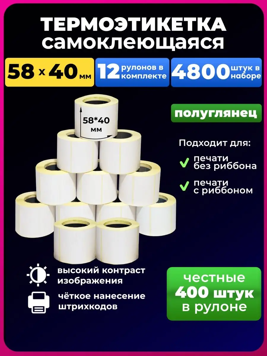 Термоэтикетки 58*40 Эко Unzi 58х40 мм. 400 шт.- это оптимальное решение для оперативной печати информации, необходимой для маркировки различной продукции в том числе и маркировки товаров для маркетплейсов. Такие термоэтикетки могут выступать в роли носителя информации о товаре или же штрих-кода. Изготавливаются из белой бездревесной бумаги с термочувствительным покрытием. В нашем ассортименте Вы найдете широкую линейку размеров термоэтикеток и количества этикеток в 1 упаковке. Размерный ряд: термоэтикетка 58х40 эко, термоэтикетка 58х40, термоэтикетка 40х30, термоэтикетка 43х25, термоэтикетка 58х60, термоэтикетка 30х20. Количество рулонов в упаковке - количество роликов в комплекте указано на первом фото. Перейдя в профиль магазина Unzi, можно найти и подобрать другие размеры термоэтикеток, таких размеров как:58/30, 58/40, 58/60, 40/30, 75/120, 30/20, 43/25, 100/150, 58х30, 58х40, 58х60, 40х30, 75х120, 30х20, 43х25, 100х150.Описание товара: Ширина этикетки - 58 мм.; Высота этикетки - 40 мм.; Термоэтикеток в рулоне - 400 шт.; Внешний диаметр рулона - 60 мм. Внешний диаметр втулки - 40 мм. Области применения термо-этикеток Unzi: термоэтикетки имеют самую широкую сферу применения отлично подходит для:- Для маркетплейсов: для маркировки товаров поставщиков маркетплейсов;- В магазинах, аптеках : маркировка товаров/продукции;- Дома: на данном виде этикеток можно писать маркером, ручкой или карандашом;- Логистических комплексах/складах для маркировки грузов;- Весы: маркировка весовых товаров;- На производствах: для контроля этапов производства;- Интернет магазинах: для маркировки отправлений или товаров на складе. Термоэтикетки 58х40 топ мм. соответствует стандартам OZON для маркировки товаров поставщика. Экономичность. Доступная цена на этикетку является одним из главных ее преимуществ. Чёткость печати. На этикетку Unzi Термо может наноситься абсолютно любая информация. Это могут быть буквенно-цифровые символы, штрих-коды, изображения или какие-либо другие данные. Напечатанное изображение отличается высокой контрастностью, что обеспечивает хорошее считывание сканирующими устройствами. Термоэтикетки отличаются наличием термочувствительного слоя на лицевой стороне, который темнеет при воздействии термоголовки термопринтера. Для работы с этикеткой можно использовать принтеры брендов АТОЛ, xPrinter, TSC, Datamax, Toshiba, Argox, Godex, Zebra, Intermec и ряда других производителей.Настройка:1. Важно перед начало печати произвести соответствующие настройки принтера и провести калибровку датчика печати этикеток по инструкции к принтеру во избежание пропуска этикеток, неточной печати.2. В настройках печати необходимо проверить и настроить такие параметры как:- тип материала;- этикетки с зазором;- метод печати: прямая термопечать. Многослойная структура. Самоклеящаяся этикетка в рулонах представляет собой специальную многослойную бумагу. 58х40 этикетки, 58 40 термоэтикетки, 58х40 термоэтикетка, термоэтикетка 58х40 мм, термоэтикетки 40х58мм, 58 40 термоэтикетки, термоэтикетка 58х40, термоэтикетки 58х40 250шт, термоэтикетки ТОП 58 х 40 мм, термоэтикетка 58 40 ТОП, термоэтикетки 58х40мм, ермоэтикетки 58*40, термоэтикетка 40х58, термоэтикетка 58 х 40 мм, 58*40 термоэтикетка термоэтикетки 58 x 40. Вся необходимая информация отпечатывается на верхнем термохимическом слое, который темнеет под воздействием термоголовки принтера. Второй слой состоит из бумаги на клеевой основе,
