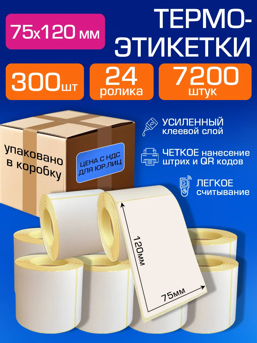 Термоэтикетки 75х120, 300 этикеток, 24 рулона в наборе, которые бережно упакованы в коробку в каждом размере. Имеют усиленный клеевой слой. Первая этикетка аккуратно отклеивается без потерь даже одной этикетки. Этикетки самоклеящиеся используются в качестве расходного материала для термопринтеров. Отличаются высокой контрастностью изображения и хорошей читабельностью, и считываемостью штрих-кода. Изображение на термоэтикетках получается контрастным, с них хорошо считываются штрихкоды, QR-Коды, а также подходят для честного знака. Подходят для применения в быту, для маркировки различных предметов, можно писать ручкой, карандашом или маркером. Термоэтикетки 75х120 мм имеют клеевой слой, хорошо приклеиваются на разные поверхности, даже неровные, изогнутые, шершавые. Этикетки для термопринтера отлично подходят для маркировки различной продукции, в том числе для маркировки товаров для маркетплейсов. Термоэтикетки 75*120, диаметр втулки — 40 мм. Термоэтикетка 75х120 в намотке 300 этикеток в рулоне, в комплекте 24 рулона.