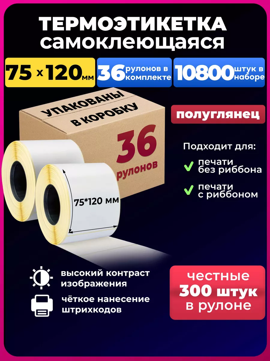 Термоэтикетки 75х120 эко– честных 300 этикеток в намотке - это оптимальное решение для оперативной и экономичной печати информации, необходимой для маркировки различной продукции в том числе и маркировки товаров для маркетплейсов. Такая термоэтикетка 75х120мм может выступать в роли носителя информации о товаре или же штрих-кода. Описание товара:Ширина этикетки - 75 мм.;Длина этикетки - 120 мм.;Трмоэтикеток в рулоне - 300 шт.;Внешний диаметр рулона - 70 мм. Внутрениий диаметр втулки - 40 мм. Количество рулонов в упаковке - количество роликов в комплекте указано на первом фото. Для маркетплейсов: для маркировки товаров поставщиков маркетплейсов;- В магазинах, аптеках : маркировка товаров/продукции;- Дома: на данном виде этикеток можно писать маркером\, ручкой или карандашом.Размер этикетки 75х120 мм. соответствует стандартам OZON для маркировки товаров поставщика. Экономичность. Доступная цена на этикетку является одним из главных ее преимуществ. Чёткость печати.Это могут быть буквенно-цифровые символы, штрих-коды, изображения или какие-либо другие данные. Напечатанное изображение отличается высокой контрастностью, что обеспечивает хорошее считывание сканирующими устройствами. Для работы с этикеткой можно использовать принтеры брендов АТОЛ, xPrinter, TSC, Datamax, Toshiba, Argox, Godex, Zebra, Intermec и ряда других производителей.Настройка:1. Важно перед начало печати произвести соответствующие настройки принтера и провести калибровку датчика печати этикеток по инструкции к принтеру во избежание пропуска этикеток, неточной печати.2. В настройках печати необходимо проверить и настроить такие параметры как:- тип материала;- этикетки с зазором;- метод печати: прямая термопечать. Поисковые запросы: Термолента / самоклеющаяся термопринтер валберис этикетки термоэтикетки листы кассовая термо бирки балон бумага термолента самоклеящаяся ламода этикетка мини термотрансферная термотрансферные xprinter клейкая ozon термоэтикетка sorel термобумага ozone.