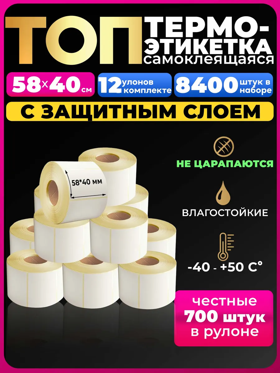 Термоэтикетки ТОП с защитным слоем для маркировки различных товаров. Обладают защитным слоем, который обеспечивает сопротивление к маслу, влаге и теплу. Размер этикетки 58х40 мм. Намот в 1 ролике 700 шт. Их используют как самоклеящиеся этикетки, одежду, штрих коды или как ценники. Изображение получается четким и контрастным, что позволяет легко сканировать. Легко самоклеятся на любые поверхности, даже неровные, изогнутые, шершавые. Отлично подойдут для маркировки товаров для маркетплейсов: wildberries, OZON и Яндекс Маркет. Этикетки для термопринтера отлично подходят для маркировки различной продукции, их можно легко клеить на картонные коробки и писать на них ручкой, также указывать содержание пакетов, контейнеров с заморозками. В наборе 12 роликов по 700 шт.