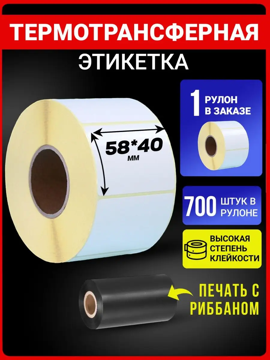 Термотрансферные этикетки 58x40 – 700 этикеток в рулоне – это вид самоклеящихся этикеток. Этикетки необходимы для нанесения штрих-кодов или текстов на этикетку, которая в последствии клеится на товар. Основной принцип нанесения информации происходит методом термотрансферной печати т.е. отпечатка текстово-графических данных происходит с помощью нагрева термоголовкой принтера красящей ленты – риббона (риббон в комлекте не идет – указан как вспомогательный элемент для идентификации метода печати). Термоэтикетки -это оптимальное решение для оперативной печати информации, необходимой для маркировки различной продукции в том числе и маркировки товаров для маркетплейсов. Такие термоэтикетки могут выступать в роли носителя информации о товаре или же штрих-кода. Области применения термо-этикеток : термоэтикетки имеют самую широкую сферу применения отлично подходит для:- Для маркетплейсов: для маркировки товаров поставщиков маркетплейсов; В магазинах, аптеках : маркировка товаров/продукции;- Дома: на данном виде этикеток можно писать маркером, ручкой или карандашом;- Логистических комплексах/складах для маркировки грузов;- Весы: маркировка весовых товаров;- На производствах: для контроля этапов производства;- Интернет магазинах: для маркировки отправлений или товаров на складе.Размер этикетки 58х60 мм. соответствует стандартам OZON для маркировки товаров поставщика.Экономичность. Доступная цена на этикетку является одним из главных ее преимуществ. Чёткость печати. Термоэтикетки отличаются наличием термочувствительного слоя на лицевой стороне, который темнеет при воздействии термоголовки термопринтера. Для работы с этикеткой можно использовать принтеры брендов АТОЛ, xPrinter, TSC, Datamax, Toshiba, Argox, Godex, Zebra, Intermec и ряда других производителей.