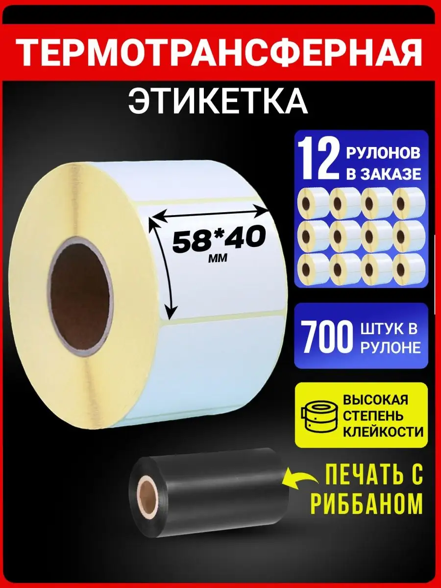 Термотрансферные этикетки 58x40 – 700 этикеток в рулоне – это вид самоклеящихся этикеток. Этикетки необходимы для нанесения штрих-кодов или текстов на этикетку, которая в последствии клеится на товар. Основной принцип нанесения информации происходит методом термотрансферной печати т.е. отпечатка текстово-графических данных происходит с помощью нагрева термоголовкой принтера красящей ленты – риббона (риббон в комлекте не идет – указан как вспомогательный элемент для идентификации метода печати). Термоэтикетки -это оптимальное решение для оперативной печати информации, необходимой для маркировки различной продукции в том числе и маркировки товаров для маркетплейсов. Такие термоэтикетки могут выступать в роли носителя информации о товаре или же штрих-кода. Области применения термо-этикеток : термоэтикетки имеют самую широкую сферу применения отлично подходит для:- Для маркетплейсов: для маркировки товаров поставщиков маркетплейсов; В магазинах, аптеках : маркировка товаров/продукции;- Дома: на данном виде этикеток можно писать маркером, ручкой или карандашом;- Логистических комплексах/складах для маркировки грузов;- Весы: маркировка весовых товаров;- На производствах: для контроля этапов производства;- Интернет магазинах: для маркировки отправлений или товаров на складе.Размер этикетки 58х60 мм. соответствует стандартам OZON для маркировки товаров поставщика.Экономичность. Доступная цена на этикетку является одним из главных ее преимуществ. Чёткость печати. Термоэтикетки отличаются наличием термочувствительного слоя на лицевой стороне, который темнеет при воздействии термоголовки термопринтера. Для работы с этикеткой можно использовать принтеры брендов АТОЛ, xPrinter, TSC, Datamax, Toshiba, Argox, Godex, Zebra, Intermec и ряда других производителей.