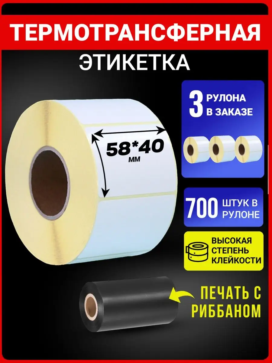 Термотрансферные этикетки 58x40 – 700 этикеток в рулоне – это вид самоклеящихся этикеток. Этикетки необходимы для нанесения штрих-кодов или текстов на этикетку, которая в последствии клеится на товар. Основной принцип нанесения информации происходит методом термотрансферной печати т.е. отпечатка текстово-графических данных происходит с помощью нагрева термоголовкой принтера красящей ленты – риббона (риббон в комлекте не идет – указан как вспомогательный элемент для идентификации метода печати). Термоэтикетки -это оптимальное решение для оперативной печати информации, необходимой для маркировки различной продукции в том числе и маркировки товаров для маркетплейсов. Такие термоэтикетки могут выступать в роли носителя информации о товаре или же штрих-кода. Области применения термо-этикеток : термоэтикетки имеют самую широкую сферу применения отлично подходит для:- Для маркетплейсов: для маркировки товаров поставщиков маркетплейсов; В магазинах, аптеках : маркировка товаров/продукции;- Дома: на данном виде этикеток можно писать маркером, ручкой или карандашом;- Логистических комплексах/складах для маркировки грузов;- Весы: маркировка весовых товаров;- На производствах: для контроля этапов производства;- Интернет магазинах: для маркировки отправлений или товаров на складе.Размер этикетки 58х60 мм. соответствует стандартам OZON для маркировки товаров поставщика.Экономичность. Доступная цена на этикетку является одним из главных ее преимуществ. Чёткость печати. Термоэтикетки отличаются наличием термочувствительного слоя на лицевой стороне, который темнеет при воздействии термоголовки термопринтера. Для работы с этикеткой можно использовать принтеры брендов АТОЛ, xPrinter, TSC, Datamax, Toshiba, Argox, Godex, Zebra, Intermec и ряда других производителей.